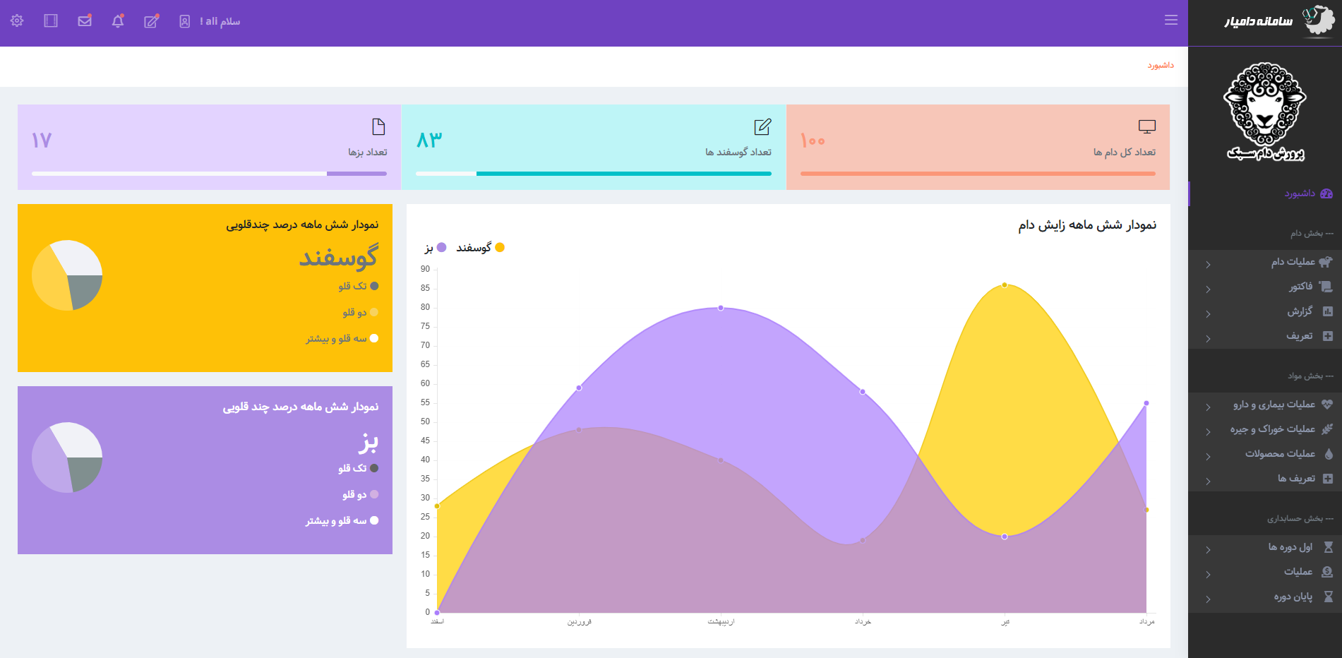 4.سامانه دامیار شامل چندین سیستم مدیریتی مربوط به یک مجموعه کامل دامپروری سبک می باشد که به صورت هوشمند و مرتبط در یک سامانه تعبیه گردیده است